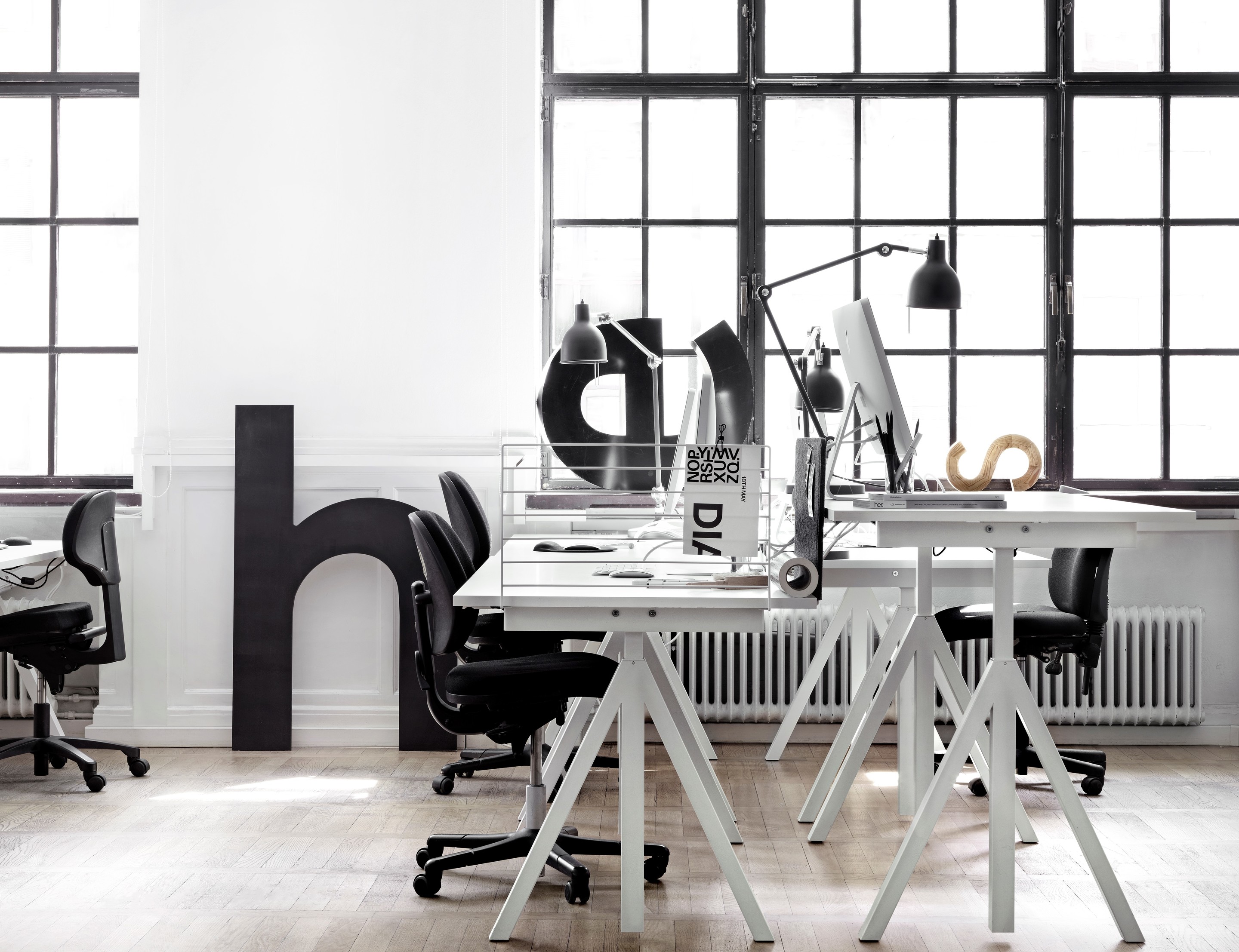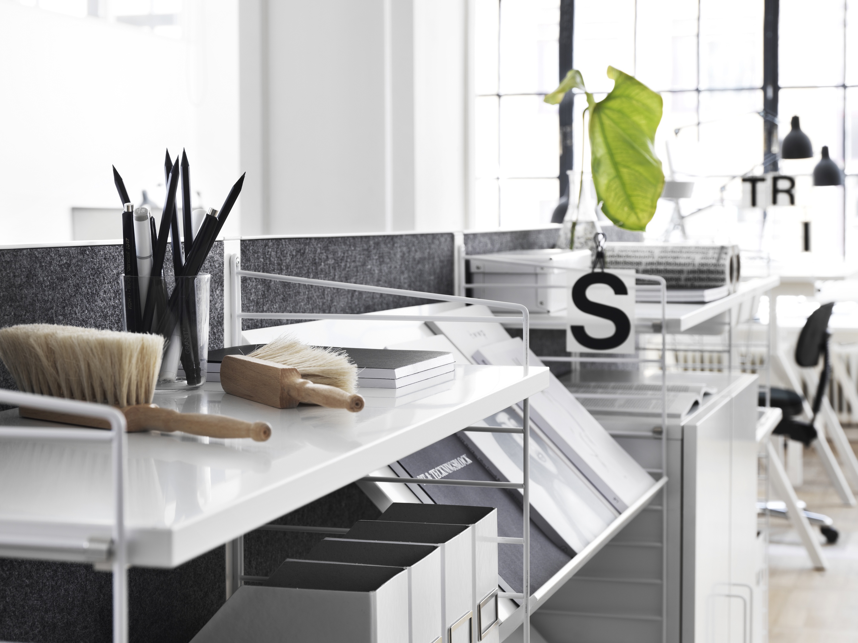 Conference table in white, ash / filing cabinets, free standing shelf, wire screen and mobile storage units in white / felt sleeve / bowl in aluminium.