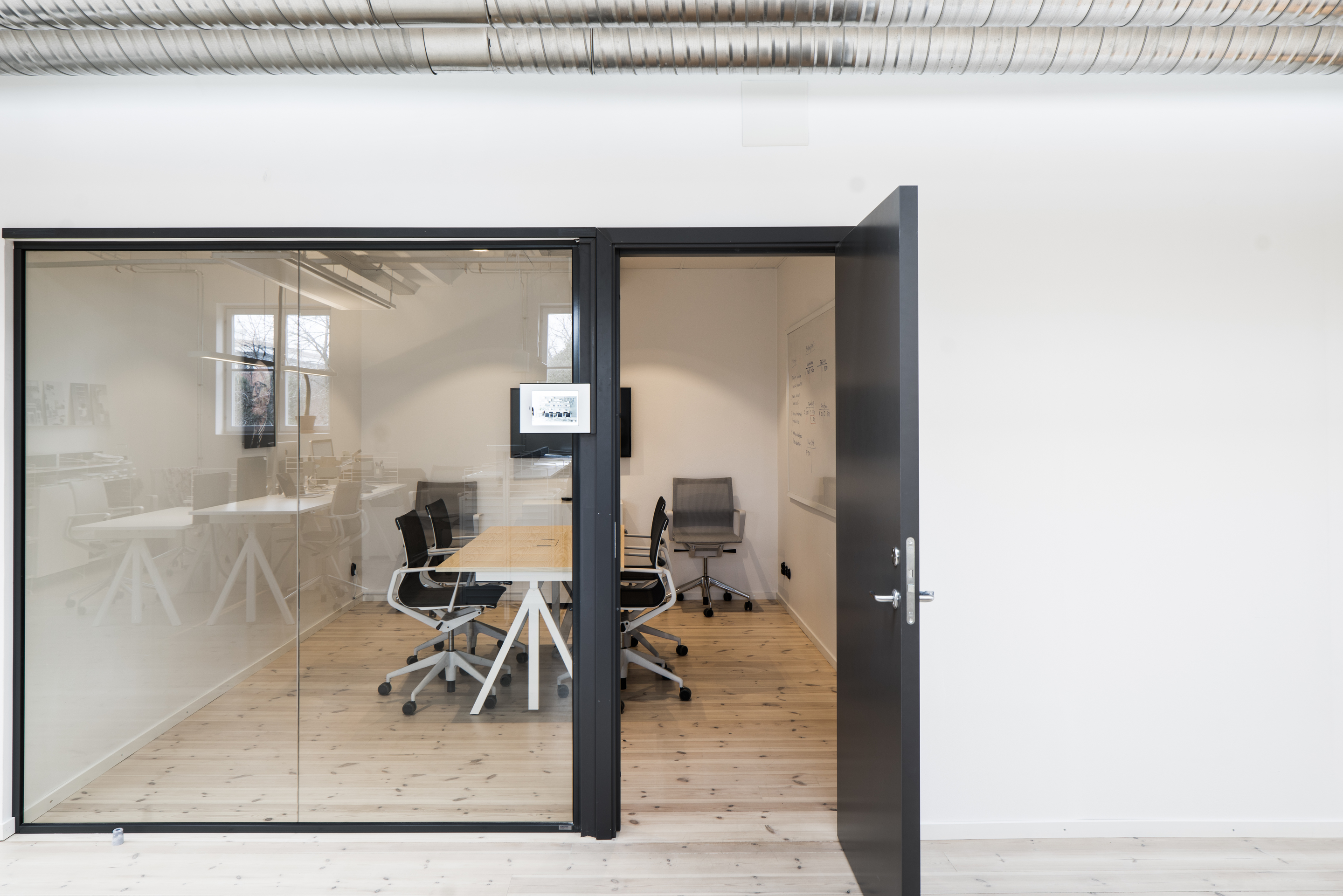 Conference table in white, ash/filing cabinets, free standing shelf, wire screen in white/ felt sleeve / wall panels, shelves and cabinets in grey, ash.